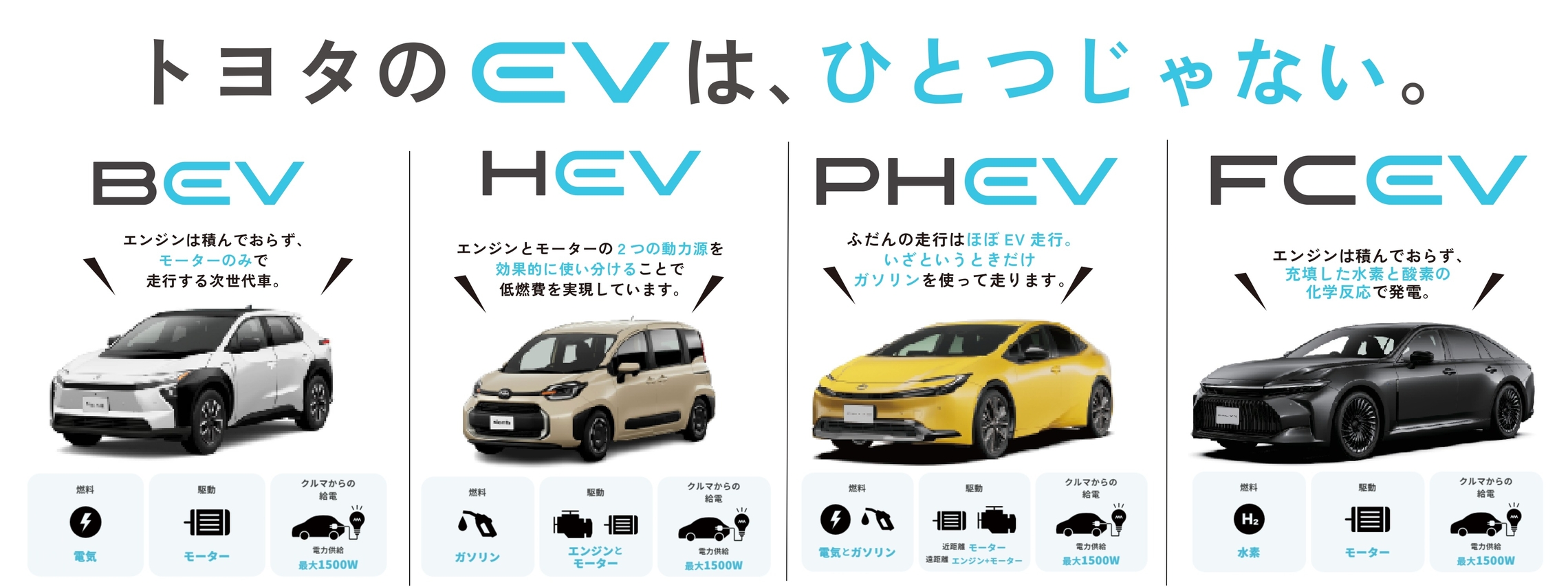 トヨタのEV(電動車)にはHEV(ハイブリット車)、PHEV(プラグインハイブリット車)、BEV(電気自動車)、FCEV(燃料電池自動車)の4種類があります。